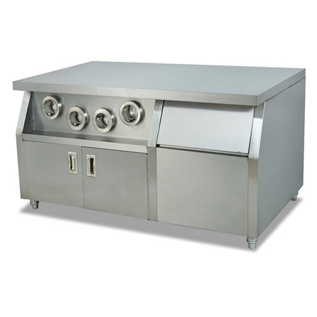 四孔分杯器中心島特性:不鏽鋼結構,自動彈杯裝置,冰桶保溫裝置。WS-02帶四個分杯器功能,帶儲冰桶。