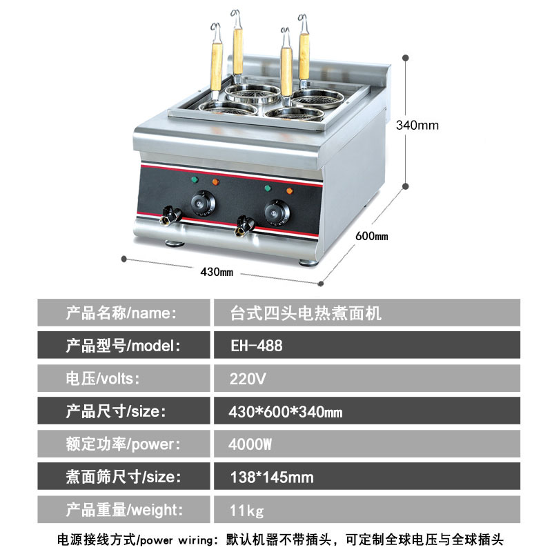 四頭電熱煮麵爐特性:全不鏽鋼結構,圓弧造形,具有曲線美,每缸單獨溫控功能,高效能發熱線,升溫速度快,帶放水閥結構,操作方便、節能省電煮麵爐是最新設計,追求高質量,吸收國內外同類產品的優點設計而成,共有四個頭,款式新穎、結構合理、操作方便、升溫速度、溫度均勻、節能省氣、環保等特點,適用於酒店、商場、超市等客流量大的場所。
