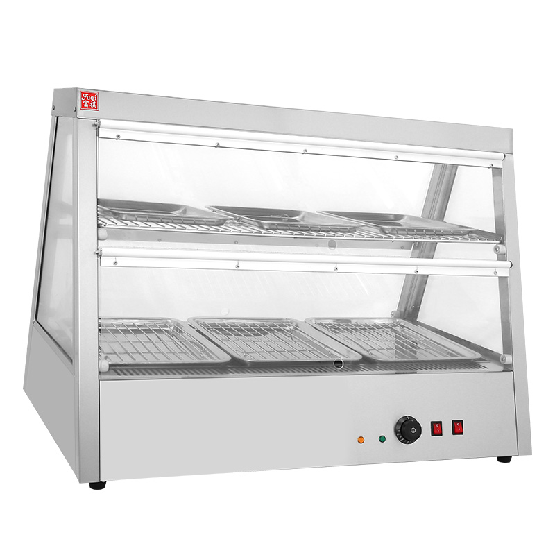 Features: double layer insulation and moisturizing function; Upper and lower independent thermostats; Four sides of heat-resistant tempered glass, strong perspective, can display food in all directions, both beautiful and durable. Moisturizing design can keep food fresh and delicious for a long time. High efficiency heat preservation design can heat food evenly and save electricity. The whole machine adopts infrared heat preservation lamp to enhance the display effect, at the same time, it plays the role of sterilization and maintains the hygiene of food. The whole machine is made of stainless steel, which is convenient for users to clean, keeps the display cabinet brand-new, and ensures the effect of exhibits.