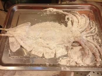 4、裹粉:在上漿後的大魷魚兩麵均勻壓上香酥雞排粉,放置回潮5分鍾;
