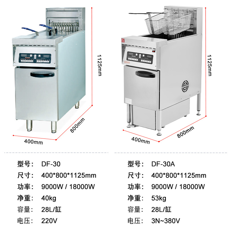 特性:電腦程序控製,專為高產量烹炸、快餐店炸薯條(餅、圈)、雞塊、魚柳等而設計,精確恒溫 2-3度 (普通電炸爐為15-20度),2.精確定時,抖籃提醒3.防止油品碳化(冷區設計),易於收集烹炸區掉下的碎渣與裹粉。操作安全 (提起發熱管自動防幹燒),熱電阻感應探頭,感應區域寬,快速靈敏。上提式發熱管,便於清潔鍋缸。單缸炸爐、雙缸炸爐,不同款式,滿足不同需求。全不鏽鋼爐身。電腦程序控製,可設置7個菜單,每個菜單有對應按鍵直接呼出,專為快餐店炸薯條(餅、圈)、雞塊、魚柳等而設計,采用特大功率進口發熱元件,升溫快,效率高,容量大,冷區設計大口徑排油管,油炸麵積為42X35cm,帶自鎖安全泄油閥。